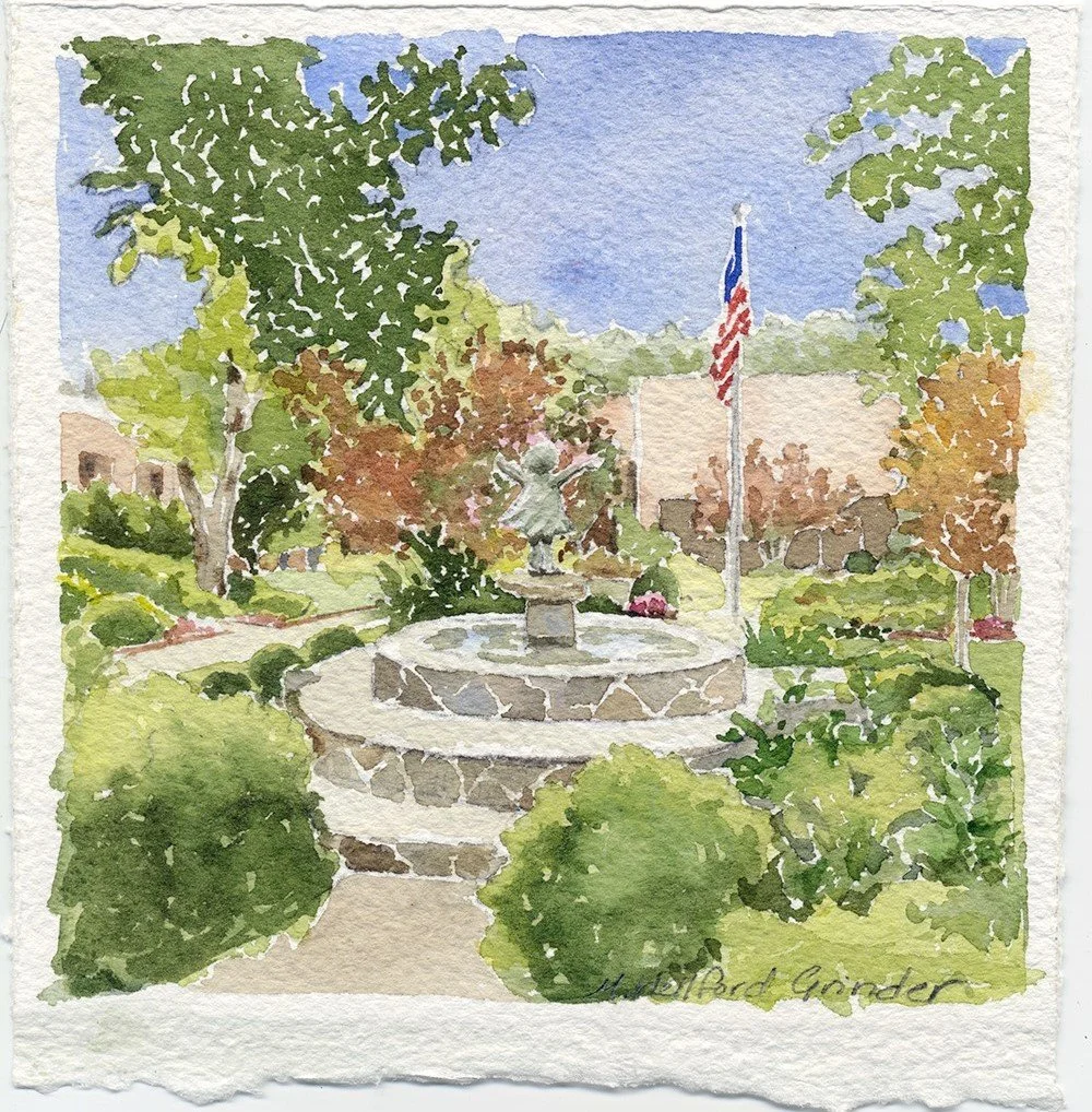 6”x6” giclee print of watercolor painting depicting the Hutchison School courtyard and the statue, “joy,” which sits in the middle of the courtyard. Printed on Hahnemuhle rag paper with deckled edges